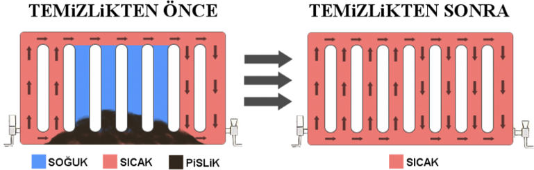 6. Genellikle burada önemli olan nokta şudur: Kombi petek tesisatında kir, çamur, çeper olur. Buna nazaran radyatör peteklerinde pek fazla kir olmaz. Bu yüzden çift yıkama çok önemlidir.